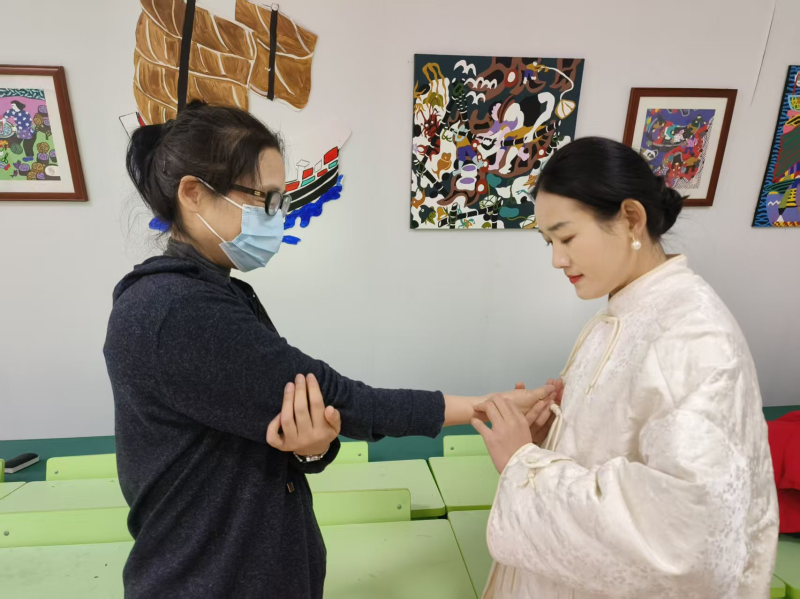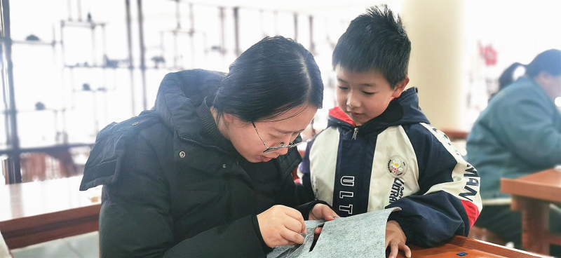 1月25日,浙江省舟山市普陀区妇儿活动中心活动室内交织着多种声音。一个活动室里,“咔嚓”“咔嚓”的裁剪声与亲子间的低语声相伴;另一个活动室里,富有节奏的拍打声随着经络走向有序起伏。