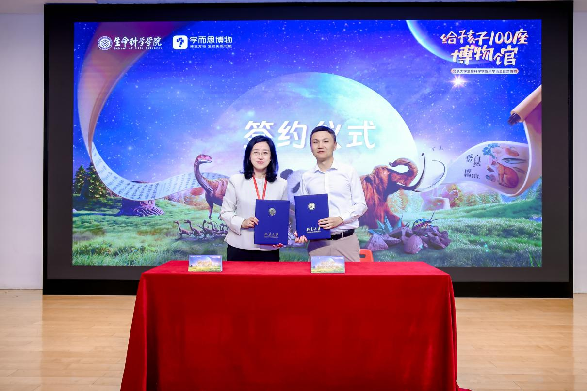 “给孩子 100 座博物馆”公益项目第二期签约仪式。右为北京大学生命科学学院党委书记石长翼,左为学而思执行总裁位晨。